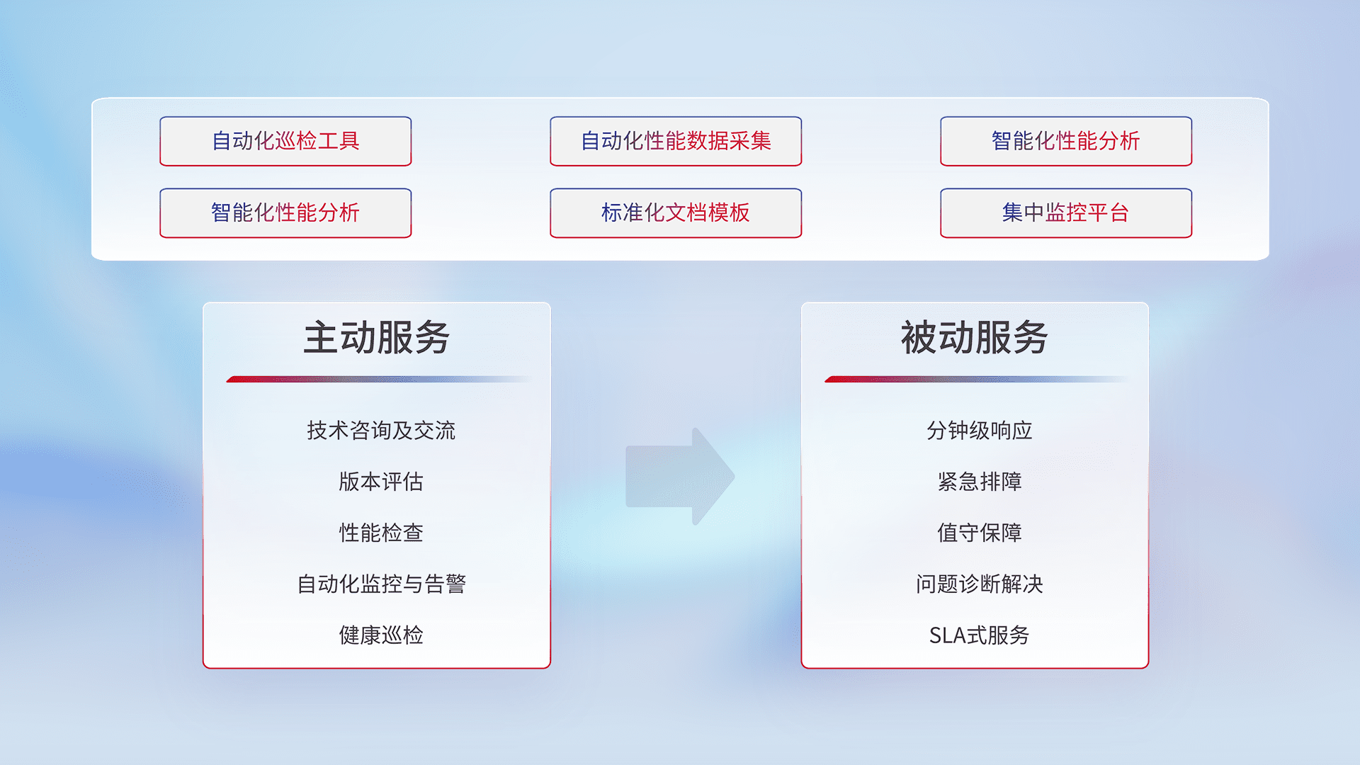 智能化工具和标准化文档,,,保障服务质量,,,,提供主动服务(包含技术咨询、、版本评估、、、、性能检查、、自动化监控与告警、、、健康巡检)和被动服务包含(分钟级响应、、、、紧急排障、、、、值守保障、、、、问题诊断解决、、SLA服务)。。。